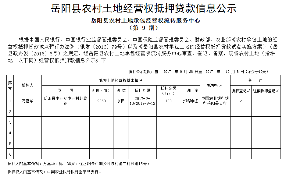 岳阳县农村土地经营权抵押贷款信息公示(第9期)