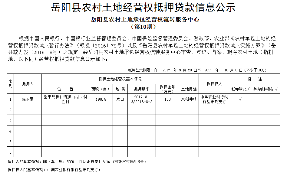 岳阳县农村土地经营权抵押贷款信息公示(第10期)