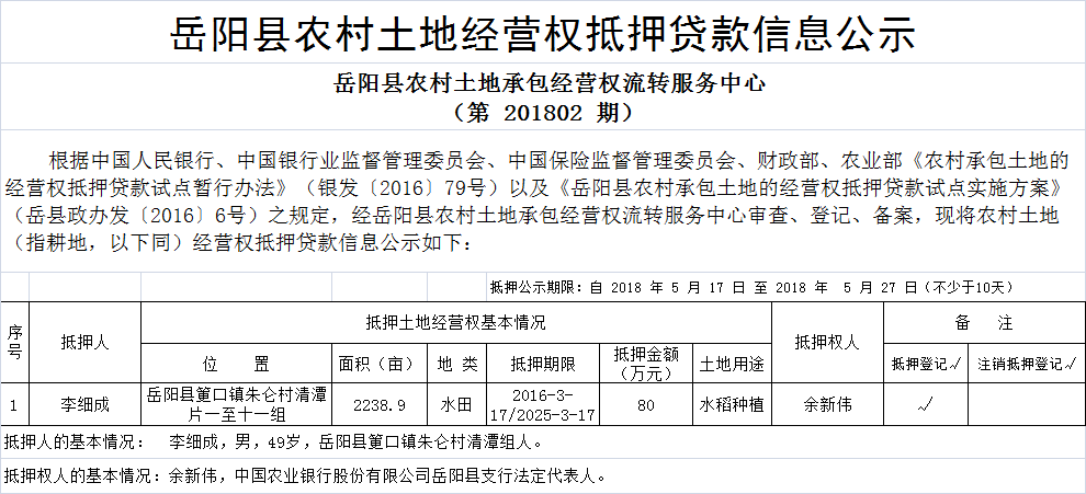 岳阳县农村土地经营权抵押贷款信息公示(第201802期)