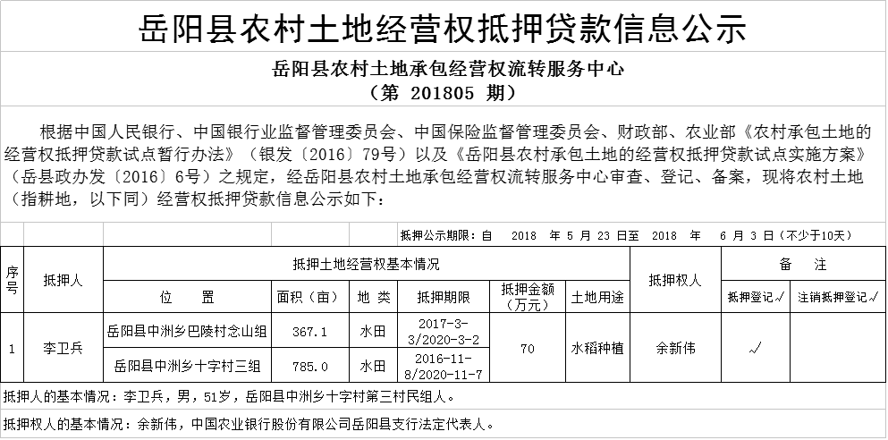 岳阳县农村土地经营权抵押贷款信息公示(第201805期)