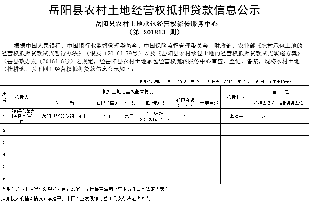岳阳县农村土地经营权抵押贷款信息公示 (第 201813 期)