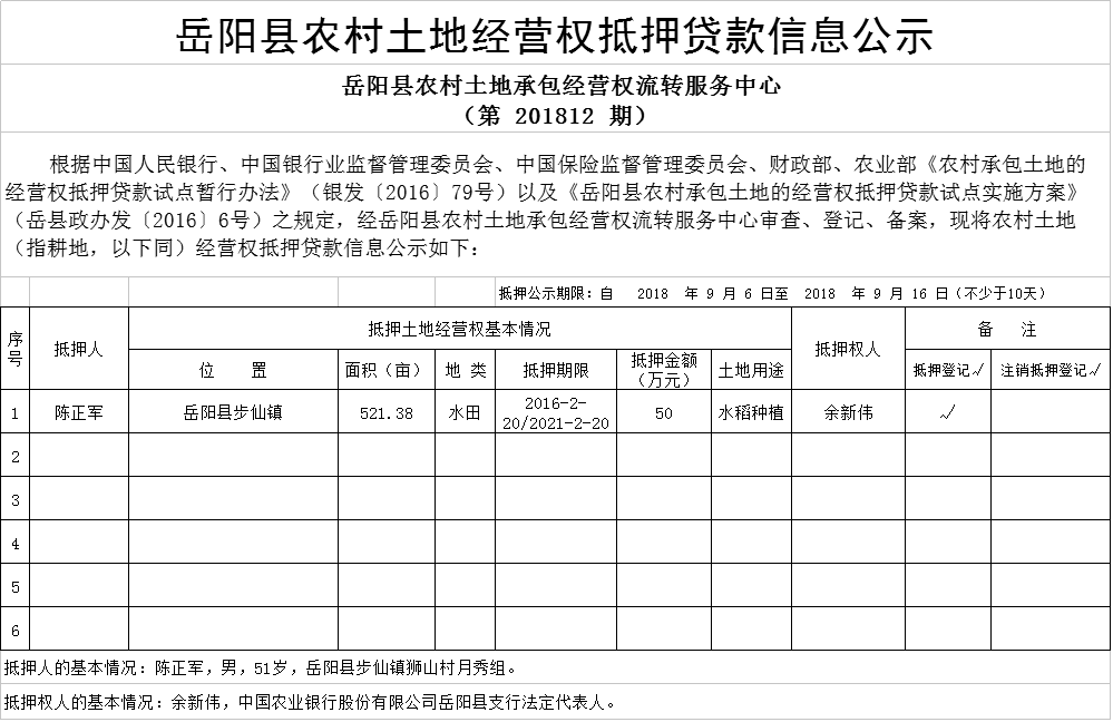 岳阳县农村土地经营权抵押贷款信息公示(第 201812 期)
