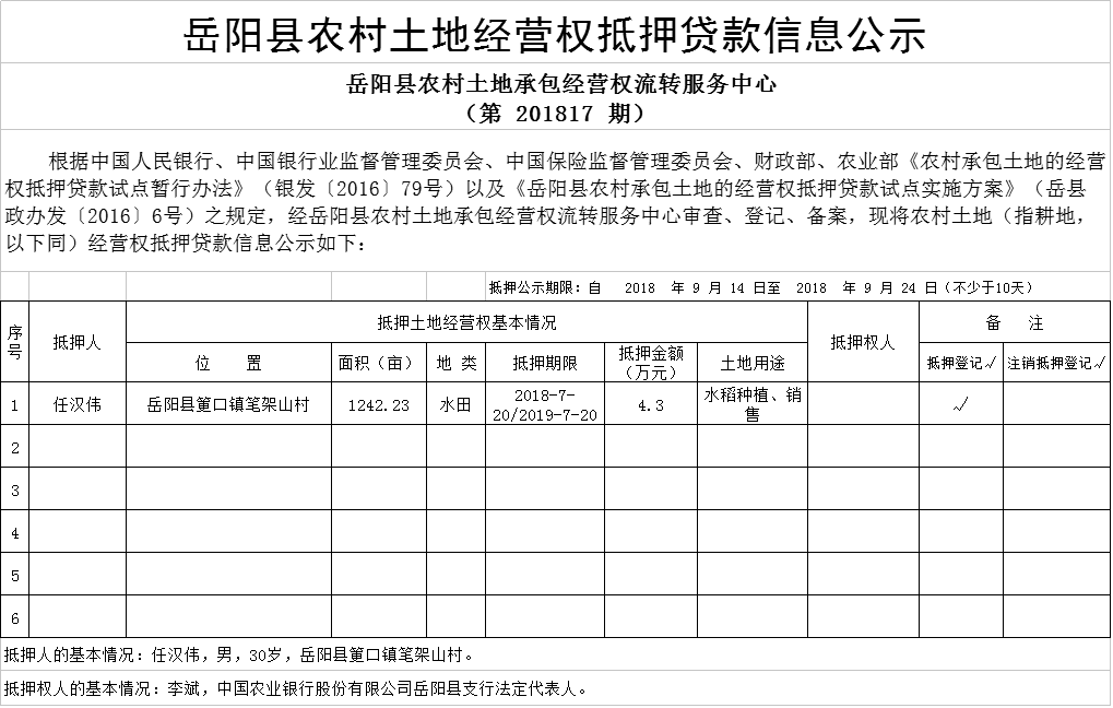 岳阳县农村土地经营权抵押贷款信息公示(第 201817 期)