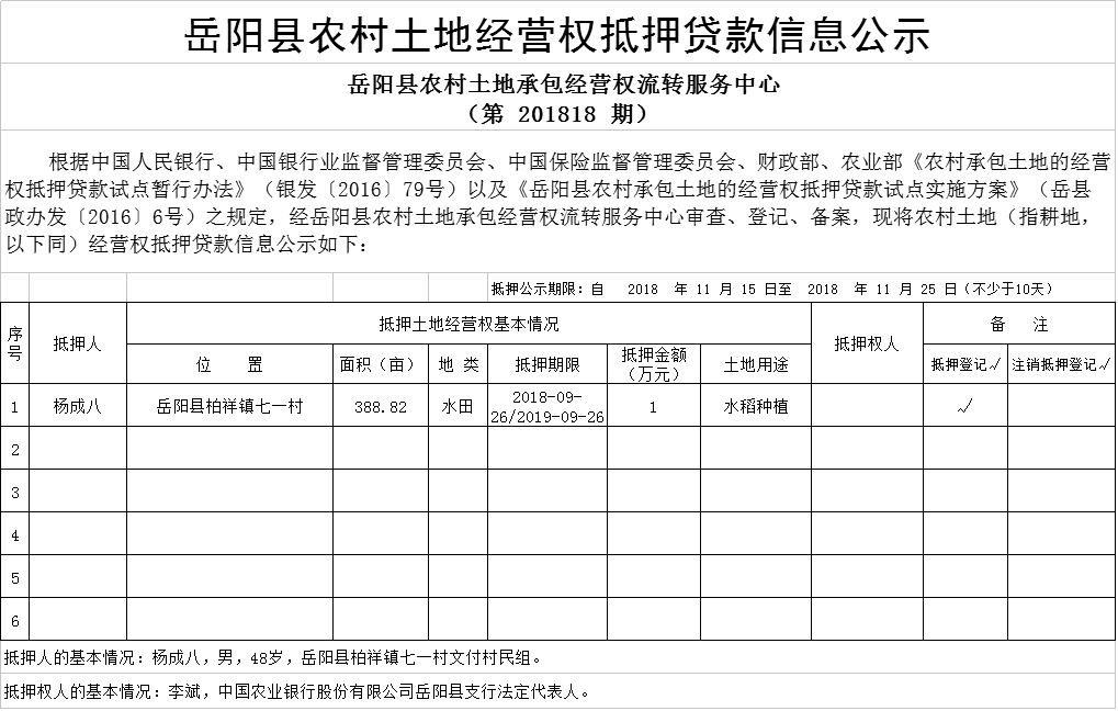 岳阳县农村土地经营权抵押贷款信息公示(第 201818 期)