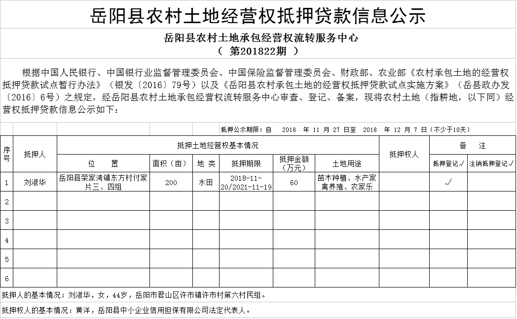 岳阳县农村土地经营权抵押贷款信息公示( 第201822期 )