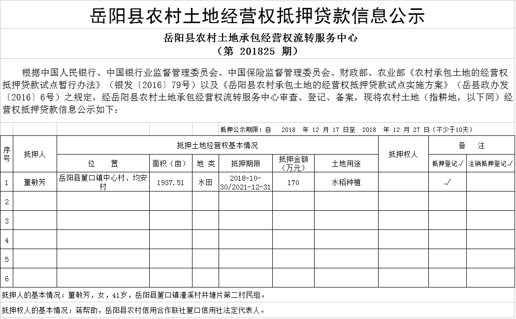 岳阳县农村土地经营权抵押贷款信息公示(第 201825 期)