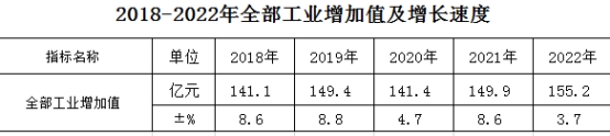 据初步核算,全部工业实现增加值155.24亿元,同比增长6.4%。其中规模以上工业企业增加值同比增长6.5%,高新技术产业园区规模工业增加值同比增长6.1%。分产业看生物医药、建筑建材、农副产品加工业总产值同比增长13.5%、8.0%、8.3%;机械制造工业总产值同比下降4.7%。全年规模以上工业企业实现利润同比下降6.9%。