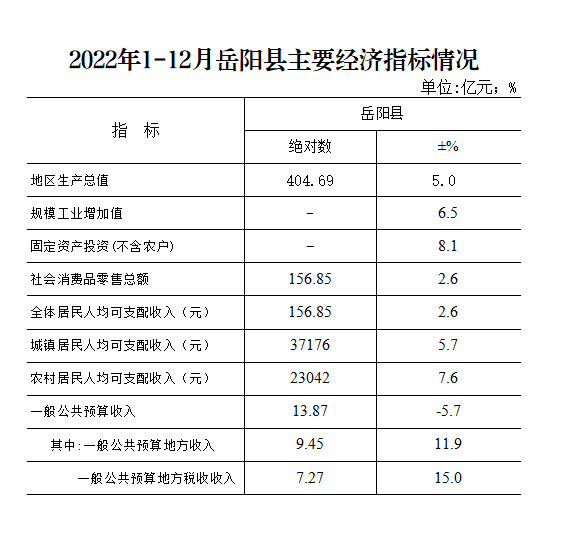 2022年1-12月岳阳县主要经济指标情况