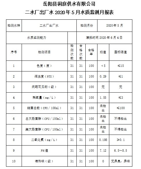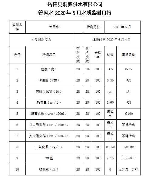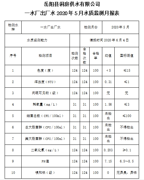 岳阳县洞庭供水有限公司关于2020年5月份的水源水、管网水、一水厂二水厂出厂水水质监测报表
