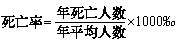 死亡率(又称粗死亡率) 指在一定时期内(通常为一年)一定地区的死亡人数与同期内平均人数(或期中人数)之比,用千分率表示。本资料中的死亡率指年死亡率,其计算公式为: