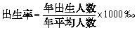 式中:出生人数指活产婴儿,即胎儿脱离母体时(不管怀孕月数),有过呼吸或其他生命现象。年平均人数指年初、年底人口数的平均数,也可用年中人口数代替。