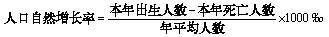 人口自然增长率 指在一定时期内(通常为一年)人口自然增加数(出生人数减死亡人数)与该时期内平均人数(或期中人数)之比,用千分率表示。计算公式为: