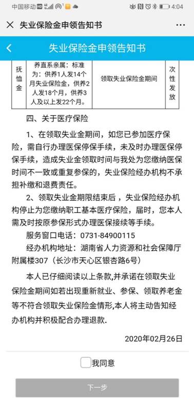 6、浏览申领告知书。了解失业保险代缴医保、职业培训补贴、一次性申领、丧葬补助金、抚恤金等权益,以及明确重新就业或领取基本养老待遇后需主动报停。