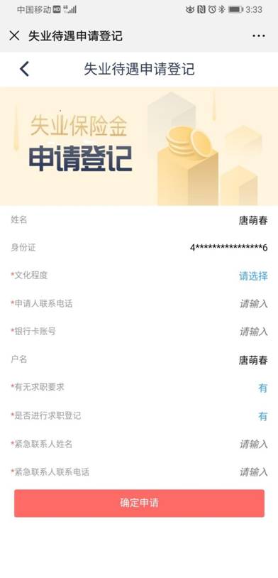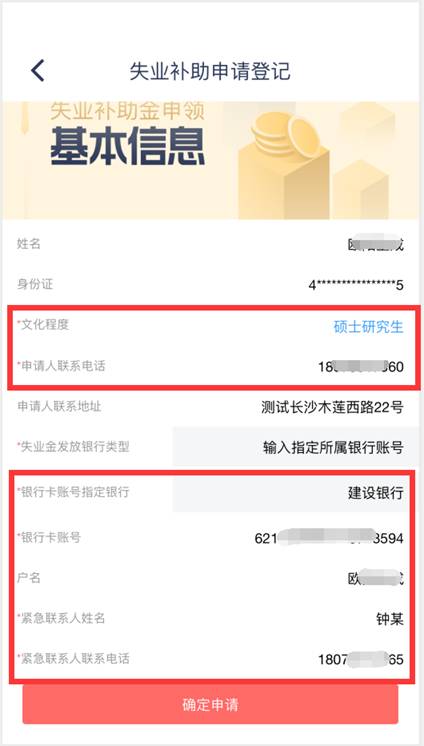 3、登记申领信息。只需填写文化程度、联系电话、银行卡账号、紧急联系人、紧急联系人电话即可完成申请。