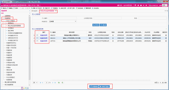5、网上失业补助金申领的审核。 失业保险经办处在核三失业保险系统-待遇管理-失业补助金申领登记-网上失业补助金申领登记 功能窗口中继续办理信息查询与申领审核业务。