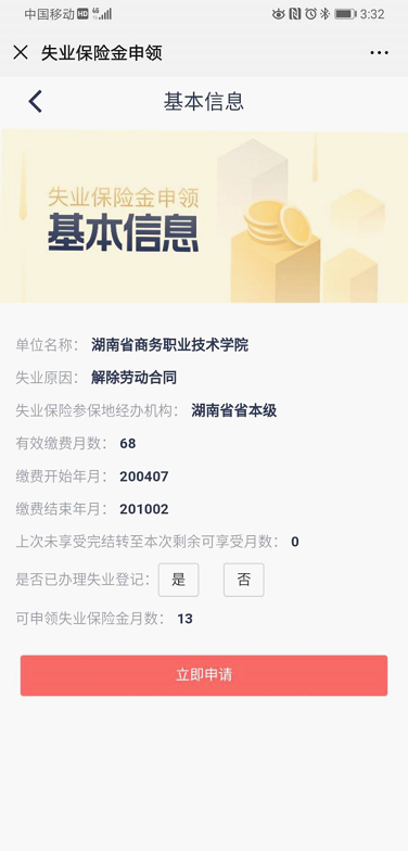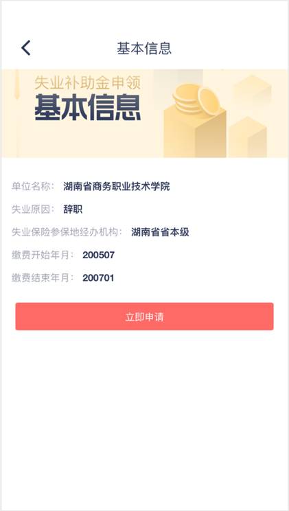 2、进入失业补助金申领主界面,进行领金条件核实,点击“立即申请”发起申领流程。