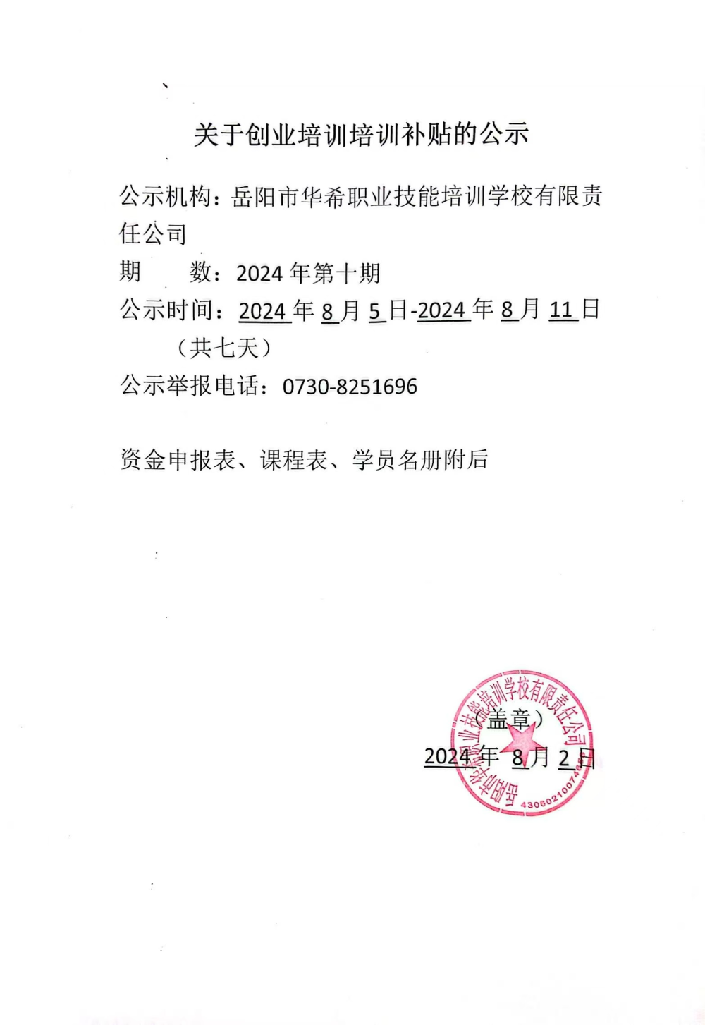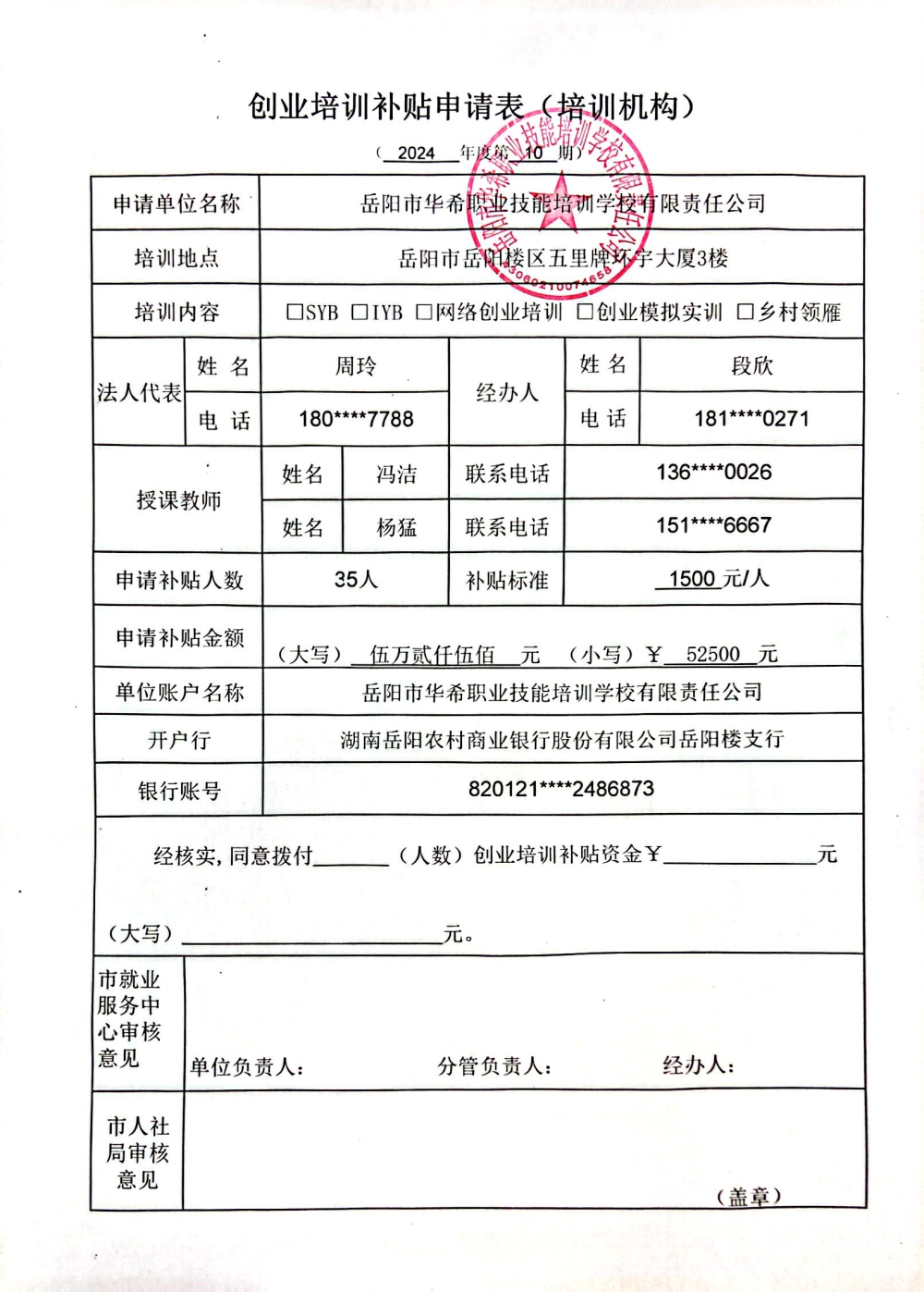 岳阳市华希职业技能培训学校有限责任公司第十期网络创业培训资金申请表、课程表、学员名册