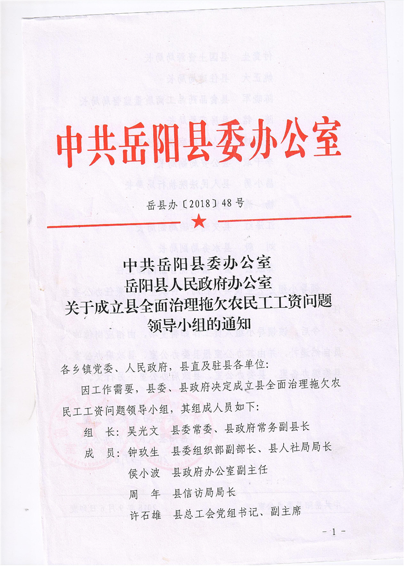 中 共 岳 阳 县 委 办 公 室 岳阳县人民政府办公室 关于成立县全面治理拖欠农民工工资问题领导小组的通知