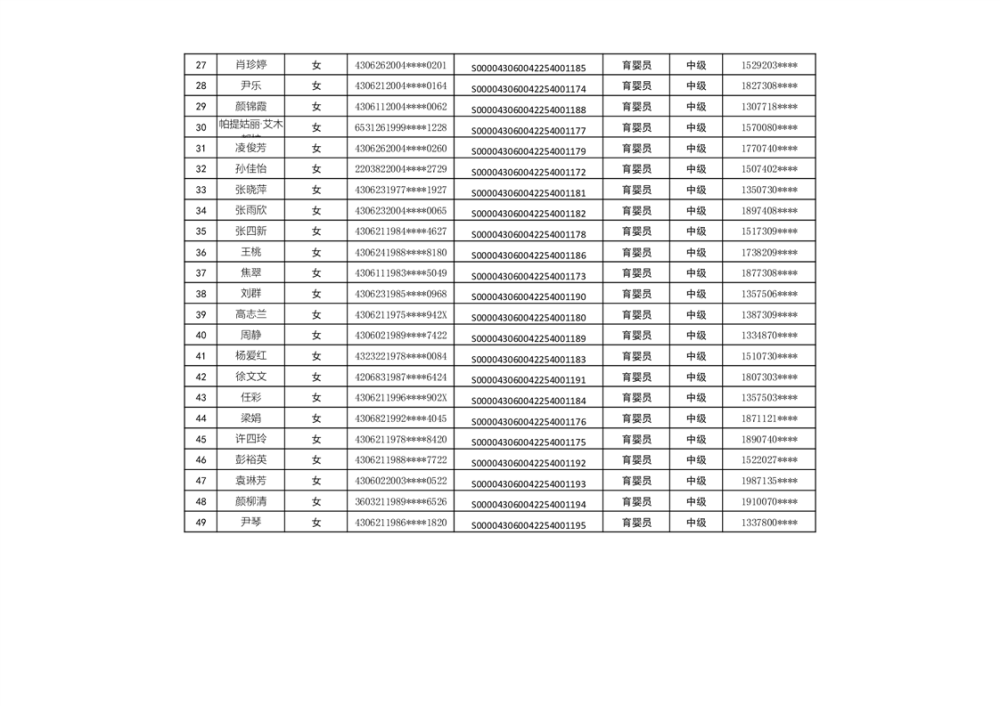 中级育婴员职业培训学员补贴花名册(三期一班)