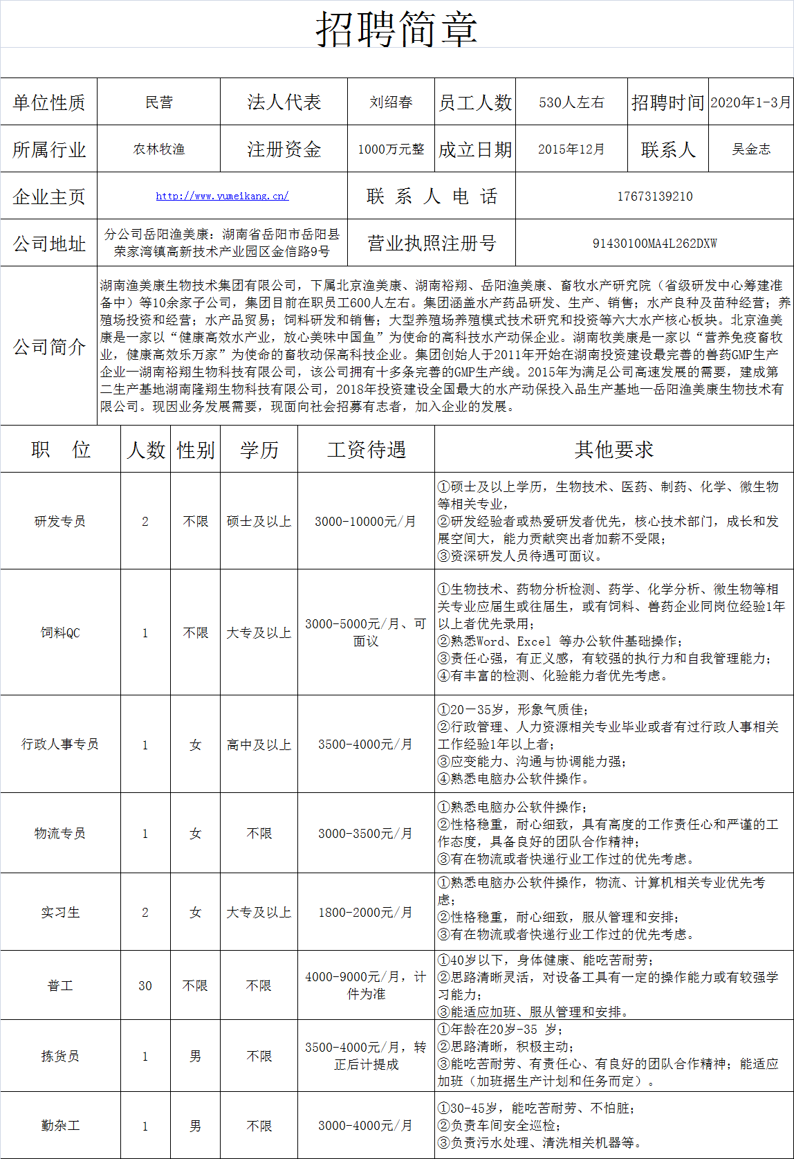 湖南渔美康生物技术集团有限公司岳阳分公司招聘简章
