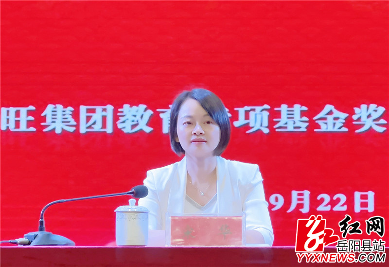 岳阳县融媒体中心9月24日讯(记者 熊佳)兴教助学点亮希望,巴陵大地丹桂芬芳。9月22日,“湖南兴旺集团教育专项基金”岳阳县第一中学专场表彰奖励大会举行。县委副书记、政法委书记、县委教育工委书记、县委教育工作领导小组组长宋华出席并讲话。湖南兴旺集团副总裁侯宇,县教育基金会理事长彭西罗出席,县教体局、县一中相关负责人,县一中获奖师生,家长代表和高三年级全体师生近1300余人参加。
