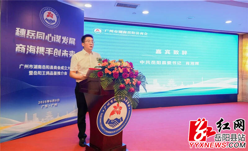 岳阳县融媒体中心6月9日讯(周星亮)6月8日,广州市湖南岳阳县商会成立大会暨岳阳王鸽品鉴推介会在广州隆重举行。县委书记肖湘晖出席大会并致辞,县领导周峰、杨前进、刘炀、王敏、敖珊,以及部分岳阳县籍在粤知名老领导,优秀企业家,市、县相关单位负责人等200余人出席本次成立大会,共同见证商会成立的历史性时刻。