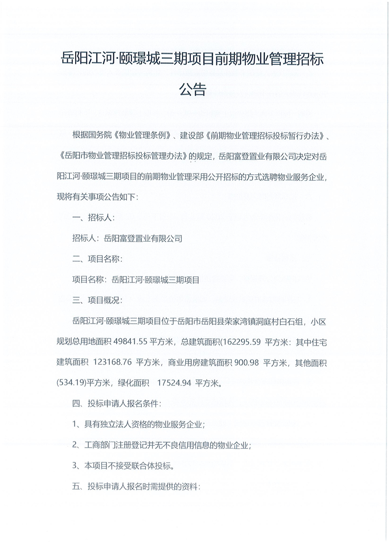 根据住建部《前期物业管理招标投标管理暂行办法》等有关规定,岳阳富登置业有限公司开发的岳阳江河·颐璟城三期项目,对前期物业管理采取公开招标方式进行招标,我局根据住建部《前期物业管理招标投标管理暂行办法》等文件中有关前期物业管理招标投标的规定,对招标文件进行网上公开公示。