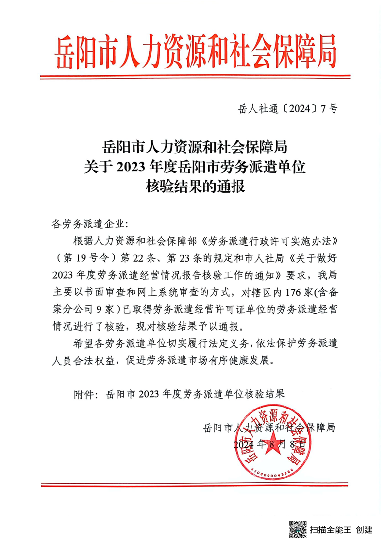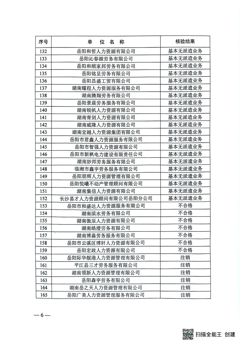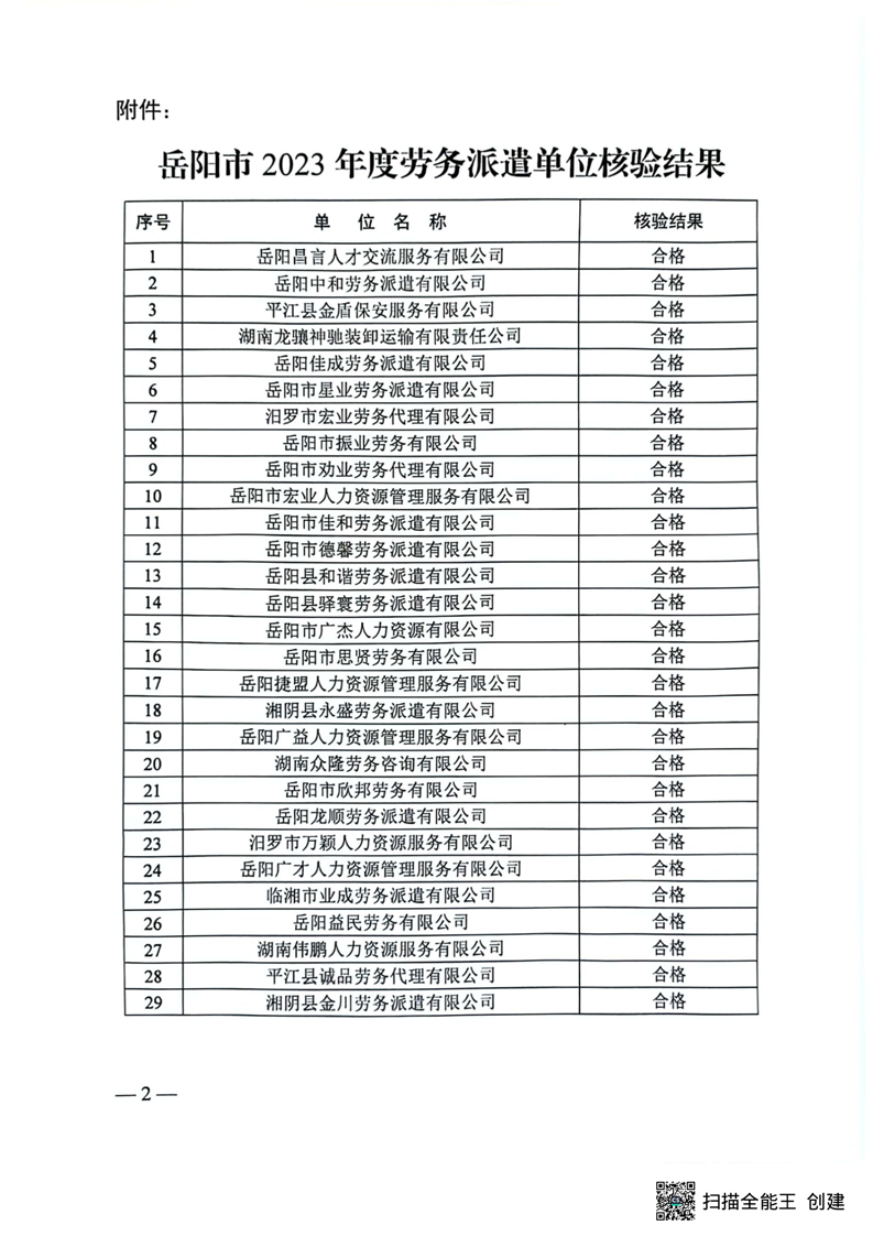 关于2023年度岳阳市劳务派遣单位核验结果的通报