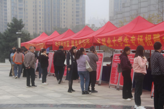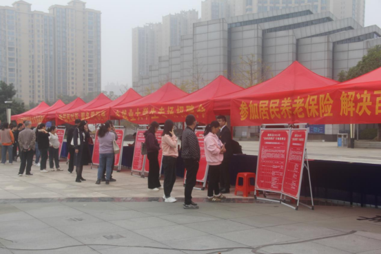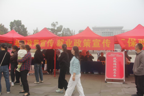 上午社保中心工作人员在县嵩韬广场设立宣传咨询点,悬挂横幅、张贴海报、发放宣传资料,对前来应聘求职的群众提出的社保政策,面对面进行政策释疑。