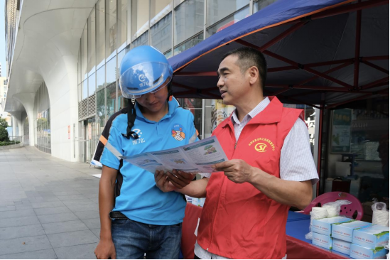 工作人员向外卖小哥等新业态从业人员宣讲社保政策