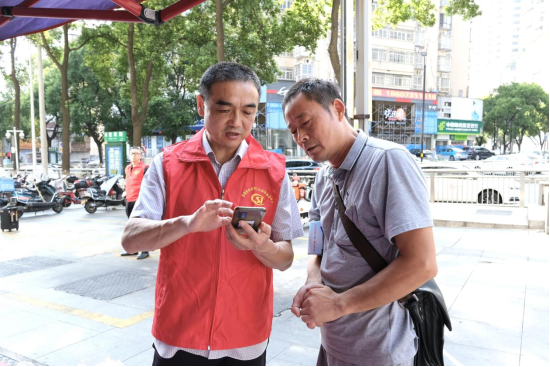 工作人员帮助退休职工学习使用手机查询和办理社保业务