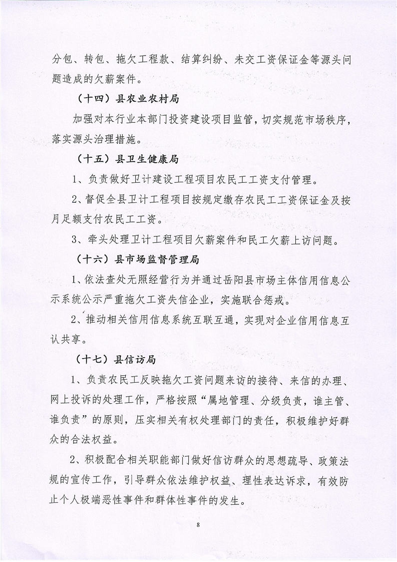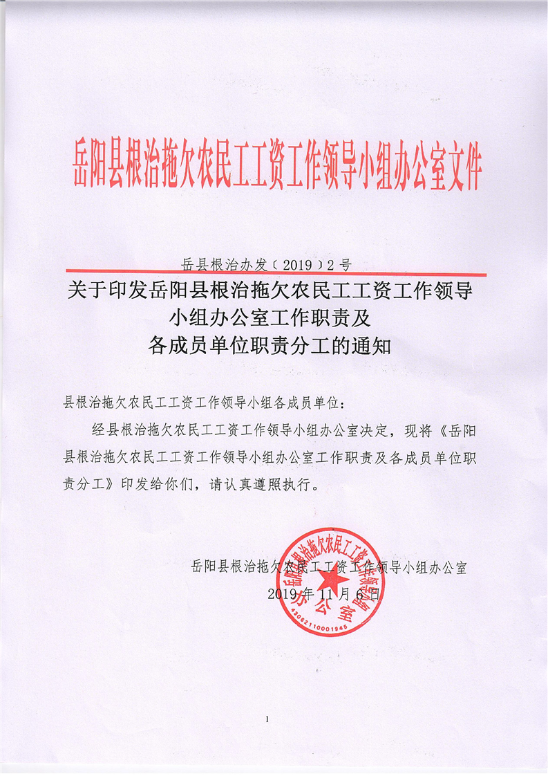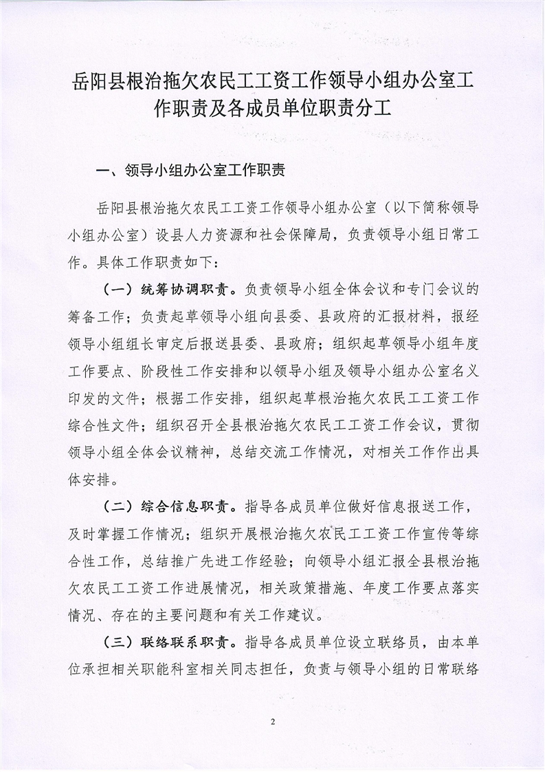 关于印发岳阳县根治拖欠农民工工资工作领导小组办公室工作职责及各成员单位职责分工的通知