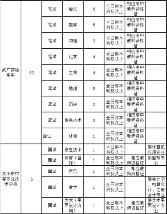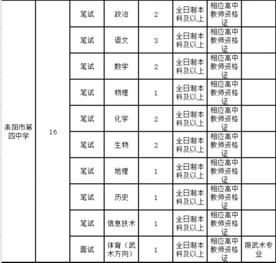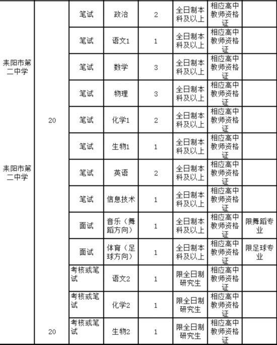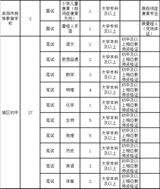 3.-龄在35周岁以下(1982-1-1以后出生),其中报考耒阳一中、二中、四中、武广实验高中、中等职业技术学校招聘岗位且有5-及以上耒阳市高中(中等职业技术)学校任教经历的以及报考特殊教育招聘岗位的,-龄放宽到40周岁(1977-1-1以后出生);