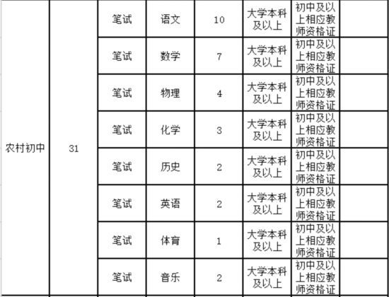 ②初中教师岗位笔试内容为公共知识和专业知识,公共知识包括教育学、心理学,占10%;专业知识为现行相应科目的初中教材内容,占90%。