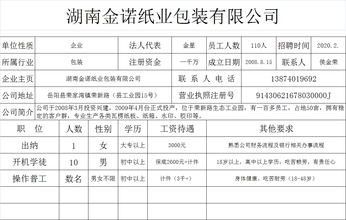 湖南金诺纸业包装有限公司招聘信息
