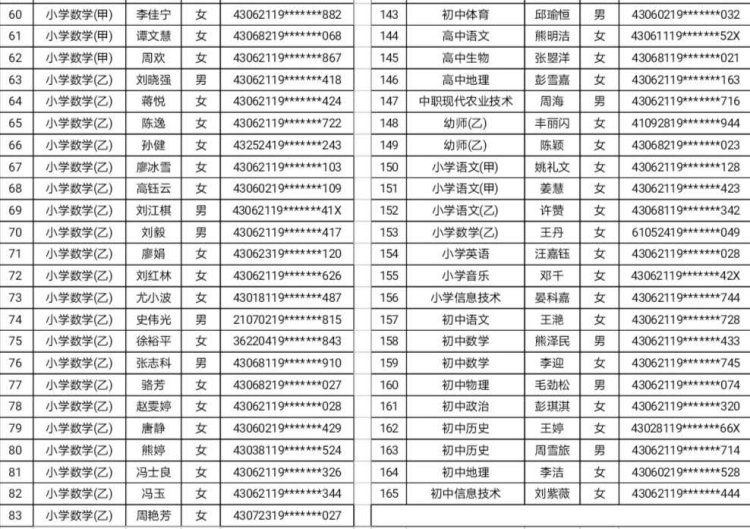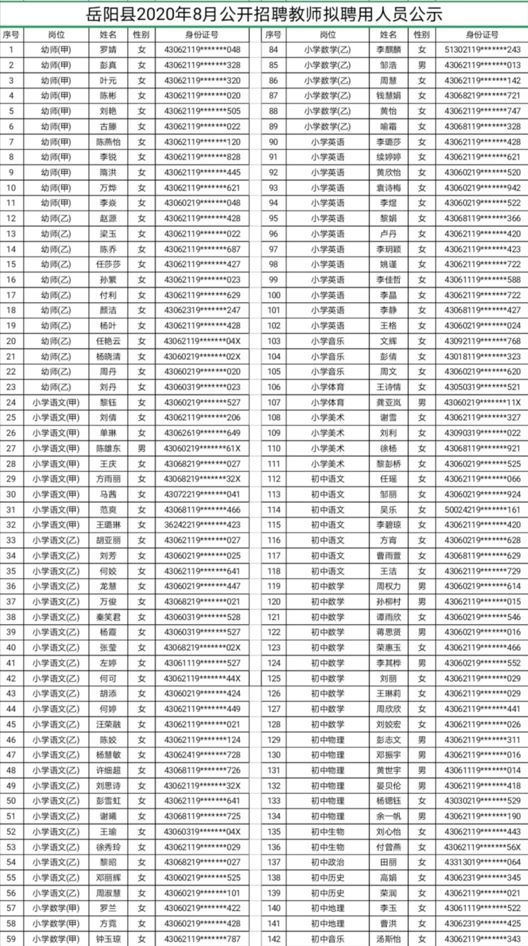 岳阳县2020年8月公开招聘教师拟聘用人员公示