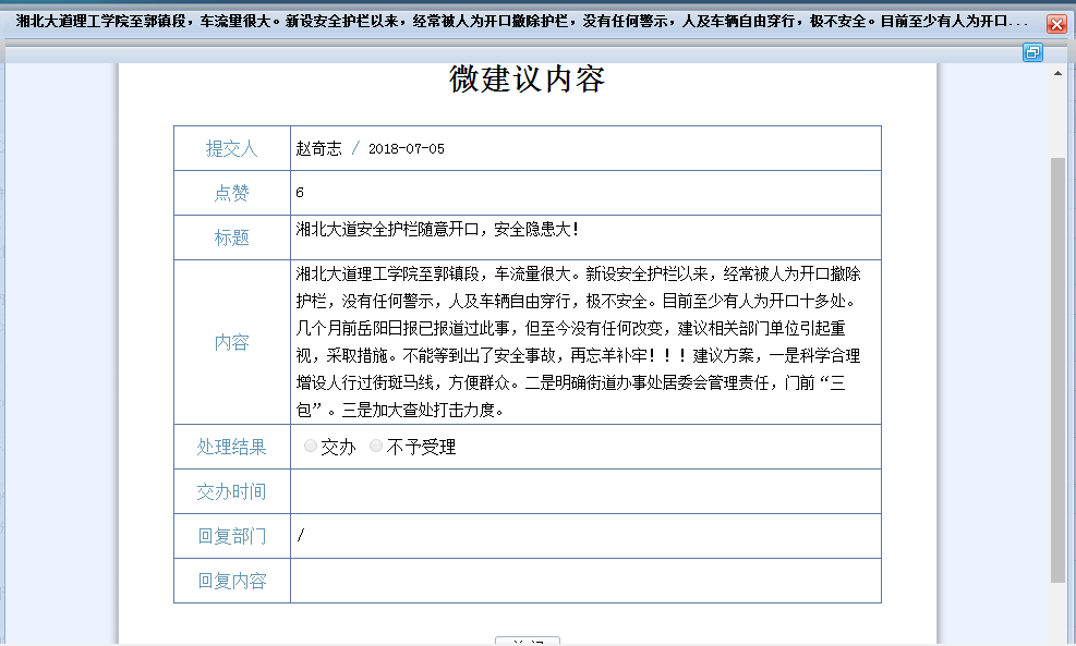 岳阳市政协委员赵奇志(189*******8)通过省政协云APP反映:湘北大道理工学院至郭镇段,车流量很大。新设安全护栏以来,经常被人为开口撤除护栏,没有任何警示,人及车辆自由穿行,极不安全。目前至少有人为开口十多处。几个月前岳阳日报已报道过此事,但至今没有任何改变,建议相关部门单位引起重视,采取措施。不能等到出了安全事故,再忘羊补牢!!!建议方案,一是科学合理增设人行过街斑马线,方便群众。二是明确街道办事处居委会管理责任,门前“三包”。三是加大查处打击力度。 |