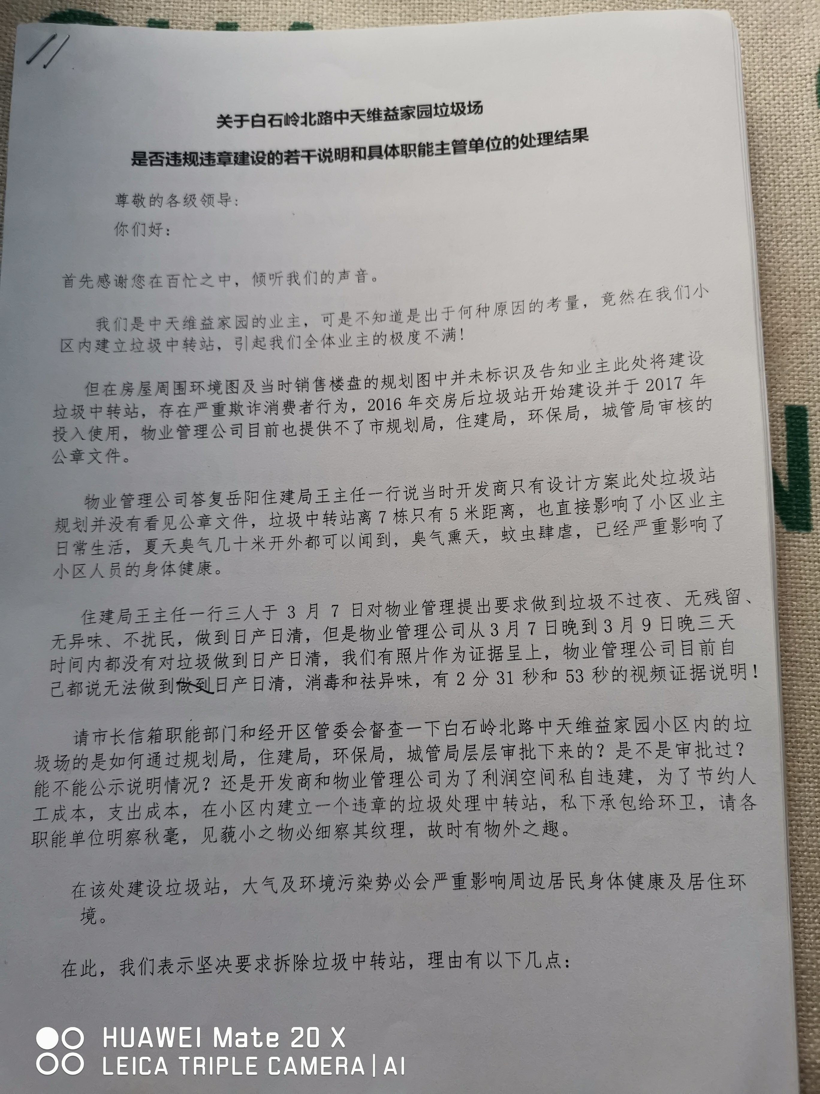 各级领导你们好! 关于白石岭中天维益垃圾场问题我们已经向市长信箱投诉举报四次了! 1.通过四次举报我们的核心只要一个,此垃圾场有没有规划局,住建局,环保局,城管局批复的法规正式公章准建文件?通过三次举报主管单位一直没有正面的回复我们和出示这些正规合法公章文件。 2.住建局提出的日产日清,消毒,祛异味,物业管理只在这段时间做到了日产日清,其他的消毒祛异味根本无法做到,我们直管部门没有从根本上以民生大方向解决问题根源。 3.我们作为小区业主的一员对在小区内建设垃圾场,深恶痛绝,我们集体102人签名要拔掉此垃圾场,对我们的日常生活影响太大了。 请主管单位正式公开出示此垃圾场的合法合规合理公章文件,以告知我们广大业主,我们不需要在这件事情上拉扯,因为受害的是我们,我们只希望你们站在民生环境上高效快速的处理问题 经开区管委会在3月21号也提出了提升公共卫生服务水平 共筑健康经开区,提升公共卫生服务质量、树立良好社会形象等方面,继续开创卫生健康工作新成就,要牢固树立以人民为中心的理念,切实增强卫生健康为民意识 希望各级领导帮我们切实的解决问题,不想正常维权路上漫漫长路不容易。 附件1:1553593423022816839262019472886.jpg 附件2:15535934550625509656417971369507.jpg 附件3:15535934813865931517506875862150.jpg |