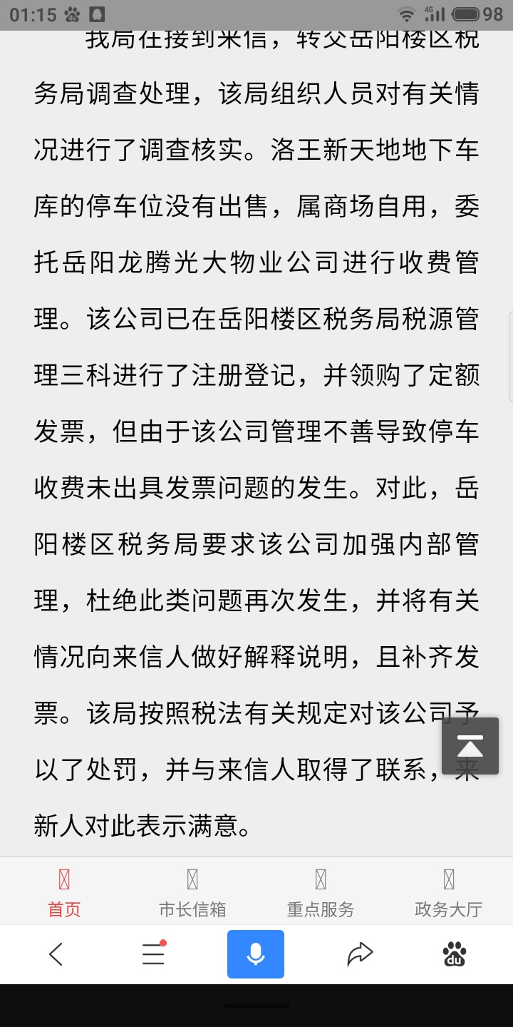 | 回复内容: | 我局收到市民朋友来信后,转交主管税务机关岳阳楼区税务局调查核实。针对来信中第3点内容,经该局调查,新天地项目开发商光大地产已对销售地下车位取得的收入申报缴纳了税款,现已督促该公司向车位购买人开具发票,并已将调查情况告知了来信市民朋友。 |