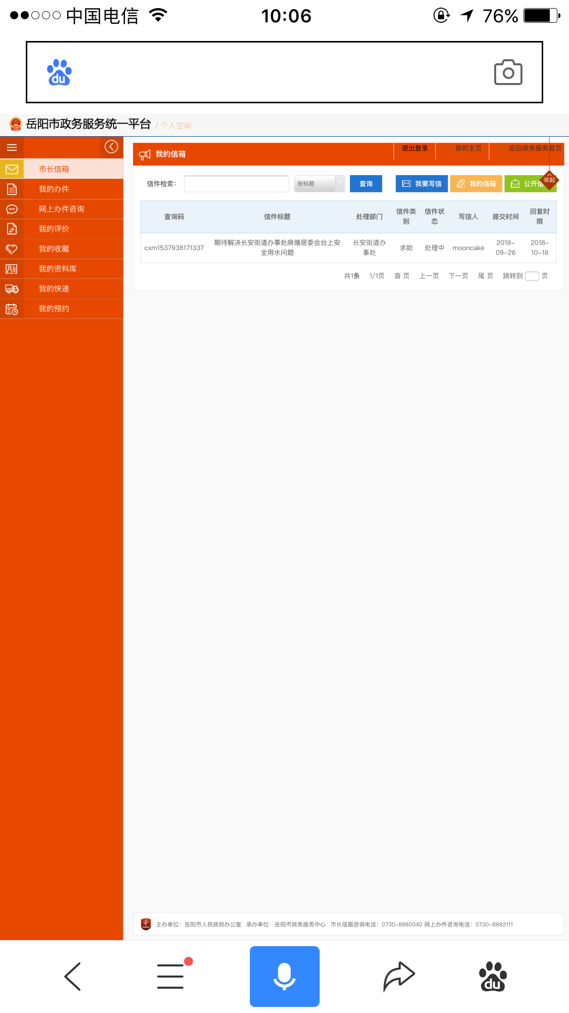 尊敬的市委领导: 本人曾于2018年9月26日通过临湘政府公共平台向市长信箱写过一封信-《关于请求解决长安街道办事处麻塘居委会台上安全用水问题的请示》,平台显示10月12日前给于处理意见反馈。长安街道办事处给出的答复既没有解决问题的具体时间,也没有明确措施。本人对第一次答复非常不满意,并反馈至平台。平台显示该信件交与长安街道办事处处理,答复反馈时限为10月18日。时至10月19日,目前仍未收到有关明确答复。 居民安全用水事关老百姓健康。恳请政府领导重视,并督促解决!此致 敬礼! 附件1:IMG_8772.JPG |