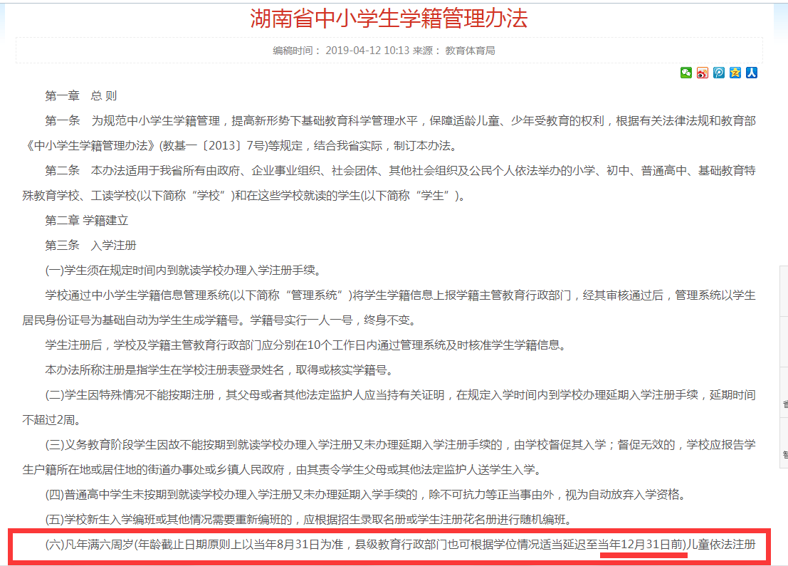 您好!您的来信我局已经收悉,根据来信的内容,现回复如下: 根据《湖南省中小学生学籍管理办法》第三条规定,“凡年满六周岁(年龄截止日期原则上以当年8月31日为准,县级教育行政部门也可根据学位情况适当延迟至当年12月31日前)儿童依法注册入学。 ”近年来我市城区学位紧张,因此都以8月31日为准;我市绝大部分乡镇学位宽松,大多都延迟到了当年12月31日前。