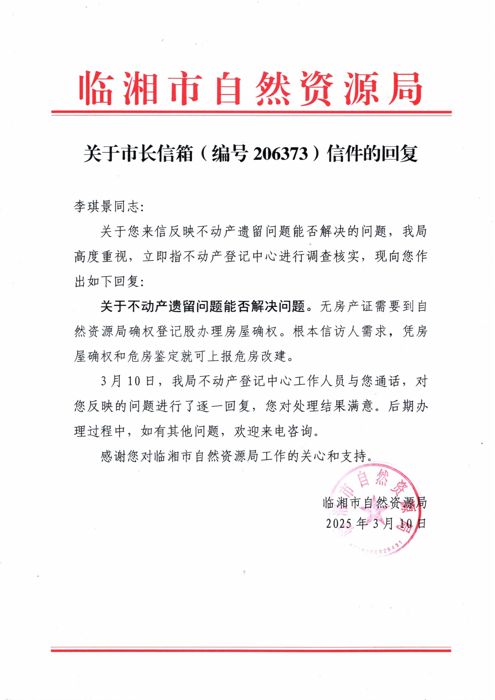 | 回复内容: | 关于市长信箱(编号206373)信件的回复 李琪景同志: 关于您来信反映不动产遗留问题能否解决的问题,我局高度重视,立即指不动产登记中心进行调查核实,现向您作出如下回复: 关于不动产遗留问题能否解决问题。无房产证需要到自然资源局确权登记股办理房屋确权。根本信访人需求,凭房屋确权和危房鉴定就可上报危房改建。 3月10日,我局不动产登记中心工作人员与您通话,对您反映的问题进行了逐一回复,您对处理结果满意。后期办理过程中,如有其他问题,欢迎来电咨询。 感谢您对临湘市自然资源局工作的关心和支持。 临湘市自然资源局 2025年3月10日