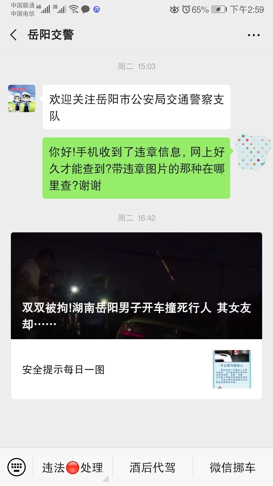 “岳阳交警”微信公众号是岳阳市交警支队官方微信平台(账号),其留言区主要用于网民对官方推文的讨论、评论,不具备受理紧急警务和业务咨询的功能,即不受理紧急警务和网民咨询。“岳阳交警”微信公众号中“违法查询”板块不提供违章照片。您可以通过手机下载一款由公安部官方互综平台推出的手机应用软件“12123”,通过该软件您可以在手机上在线查询和处理自己名下或绑定机动车的交通违法。“12123”平台数据与公安交管服务平台是同步的。感谢您对公安交通管理工作的关心和支持。谢谢!