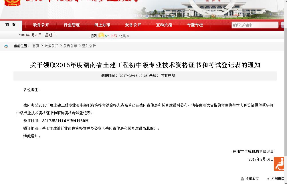 | 回复内容: | 你好!岳阳市土建初中级职称证书正在按程序审批办理中,估计在3月底或4月初开始发放。届时将在住建和人社部门网站发布通知。由于今年涉及机构改革职能调整,发证时间推迟,给你带来不便,敬请谅解! |