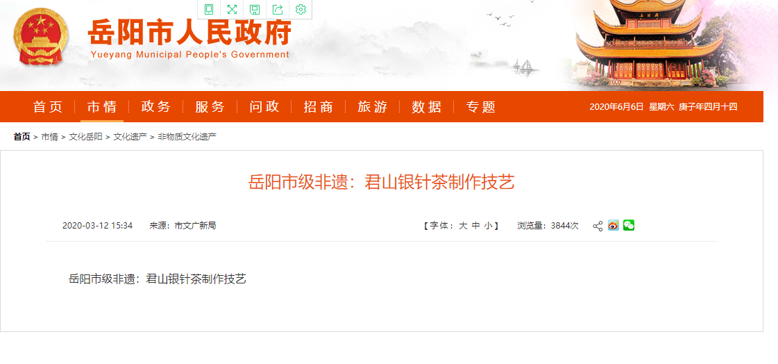 | 内容: | 君山银针茶制作技艺(黄茶制作技艺)是不是非物质文化遗产?是岳阳市市级非物质文化遗产,还是湖南省省级非物质文化遗产呢?能否告知相关公告、文件在哪查询。 附件1:岳阳市级非遗君山银针.png |