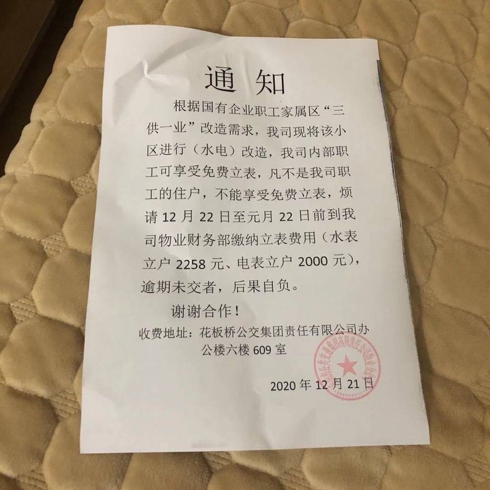 | 回复内容: | 网友您好: 您所反映的问题已收悉,感谢您对公交的关心、支持与理解。我集团该小区水电改造不符合三供一业条件,审批没有通过,因此所有改造费用均需自行承担,职工享受单位福利,费用由单位承担,非本单位职工费用需自行承担。改造费用是由自来水、电业局结合工程成本核算出来的,公司没有收取任何附加费用并承担了主管线和变压器安装费用。本次水电改造采取自愿原则,并非强制性要求。 特此回复 市公交集团 2021年1月6日 |