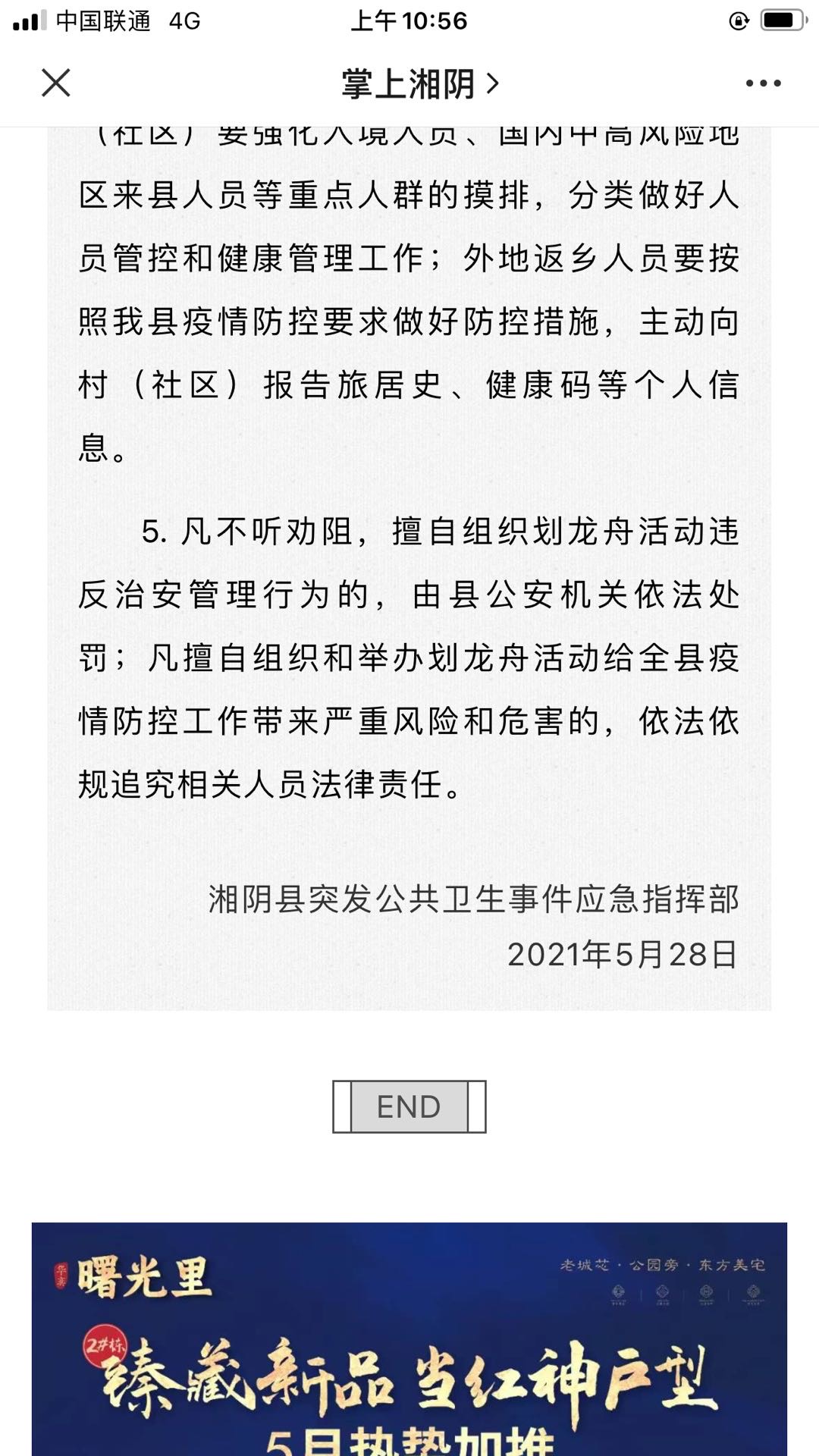 | 回复内容: | 您好,来信收悉,现回复如下: 鉴于当前疫情防控形势和防汛要求等因素,根据湘阴县突发公共卫生事件应急指挥部日前发布《关于2021年“端午”期间禁止组织划龙舟活动的通知》明确端午节期间全县所有水域禁止组织划龙舟活动。 一、我县作为全省防汛重点县之一,当前江河湖库水位较常年明显偏高3-6米,端午节期间高水位仍将维持,湍急的水流、龙舟竞渡及围观群众,都会给大堤外坡及穿堤建筑物带来极大安全隐患,有鉴于此,我县不宜组织开展划龙舟活动。 二、随着端午节假期临近,人员流动和聚集导致疫情传播的风险加大,为进一步落实落细疫情防控措施,全力维护人民群众生命安全和身体健康,今年端午节期间,禁止任何单位、社会组织和个人以任何理由擅自组织和举办民间划龙舟活动。 鹤龙湖镇人民政府 2021年6月2日 |