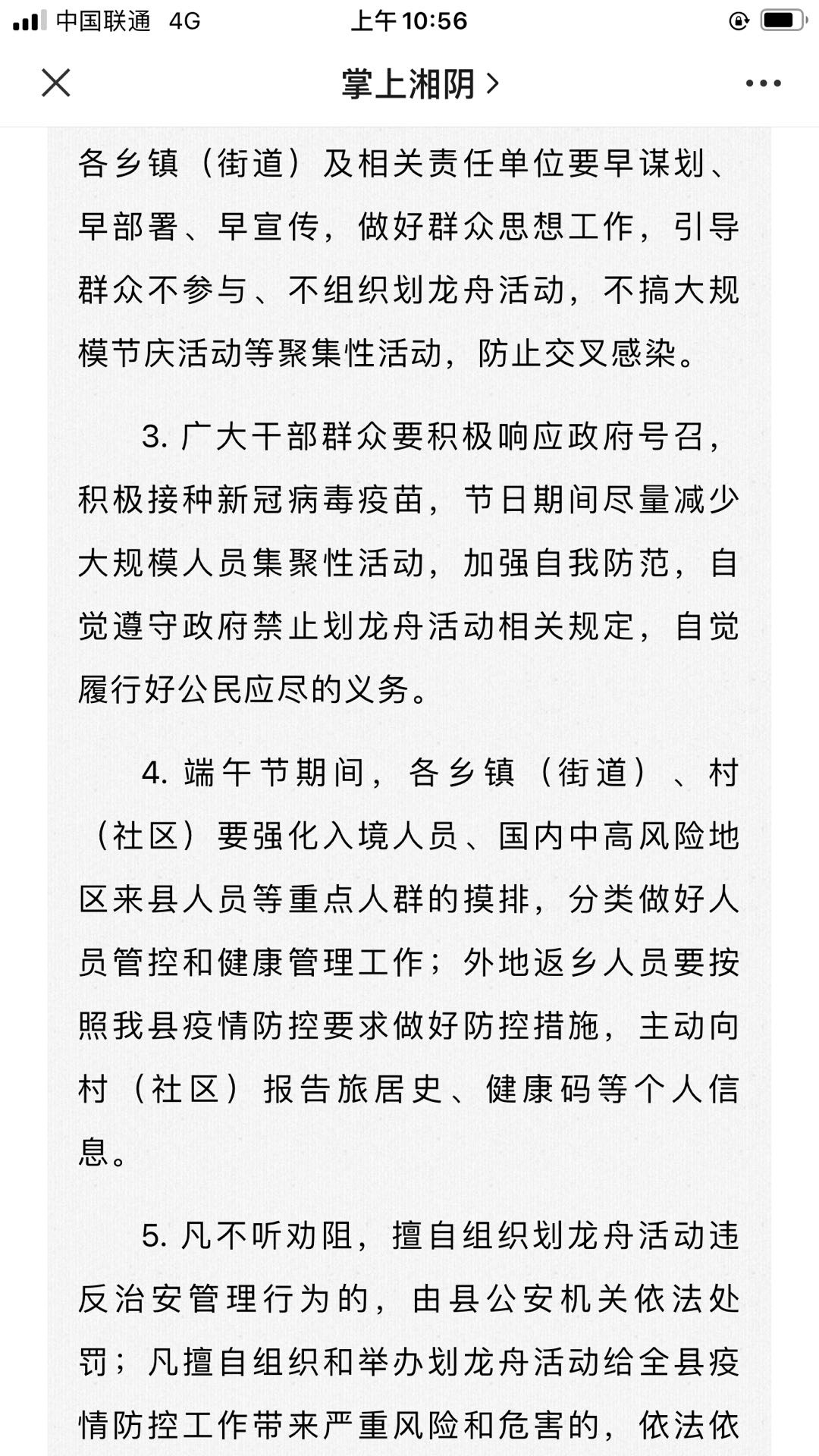 | 内容: | 领导好,我是湘阴县鹤龙湖镇一名龙舟爱好者,如今端午佳节即将来临之即,我县发出禁止划龙舟红头文件。我想问下今年为什么龙舟赛不能举行?