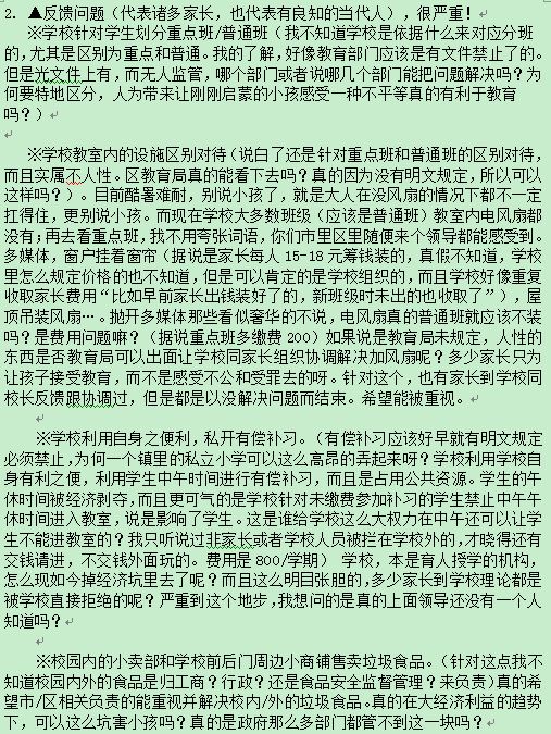 | 再次反馈: | 回答小部分满意,大部分则不理解。没人电话咨询,也没见到钱粮湖与家长实际确认,就下定义回复。委派人员到实验小学实地调查,这让有些让家长们疑惑,感慨万千。1)办学性质、管理归属问题谢区教育局回答;2)重不重点我也不纠结了,区教育局做了“深入”调查回答的,就不反驳了。家长们重点关心的教室设施问题,我倒真希望暑假会尽快解决。(隐形的窗帘收费问题也无情被你们避开,省了个事,你们挺好!继续发扬大无畏精神!)3)关于违规补课和有偿家教家养问题。你们调查,暂没发现这种情况。我想问是如何经查?电话?短信?怎么个实地查的?我外甥大中午大热天进教室被老师拦着说没交补习费,在外面不能影响参加补习的。这个事谁问了?谁查了?是不是区教育局会回一个官方话“此乃个别教师个人行为?”对吗?4)小卖部食品安全,区教育局等于做了保证?食品OK?在此再次感谢区食品药品监督局、区教育局的抽检。仅仅感谢抽检。(如果做几次巡检,突击检,您相信结果一致不?领导们!) 以上可能带有部分个人情绪,请有关领导理解。区教育局认为解决了的问题那就当解决了吧。相信当包不住的时候,区里领导就明白了。真心希望实地查不是走过程、走过场。而是实求实的综合调查得结果。 |