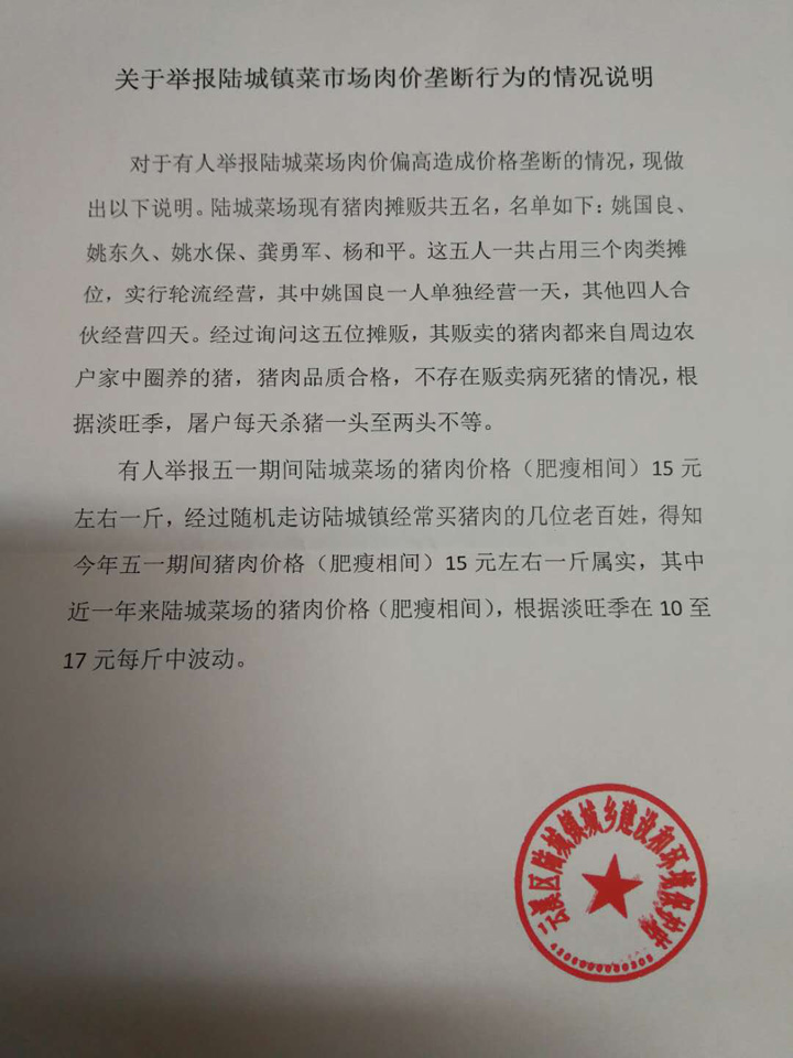 | 标题: | 关于举报陆城镇菜市场肉价垄断行为 |